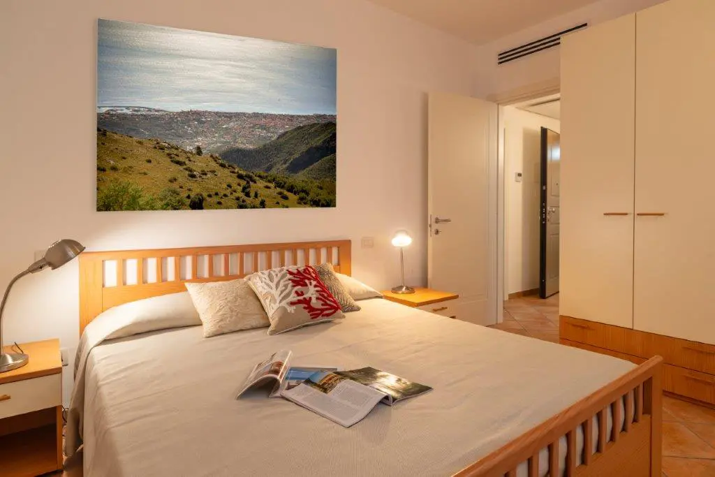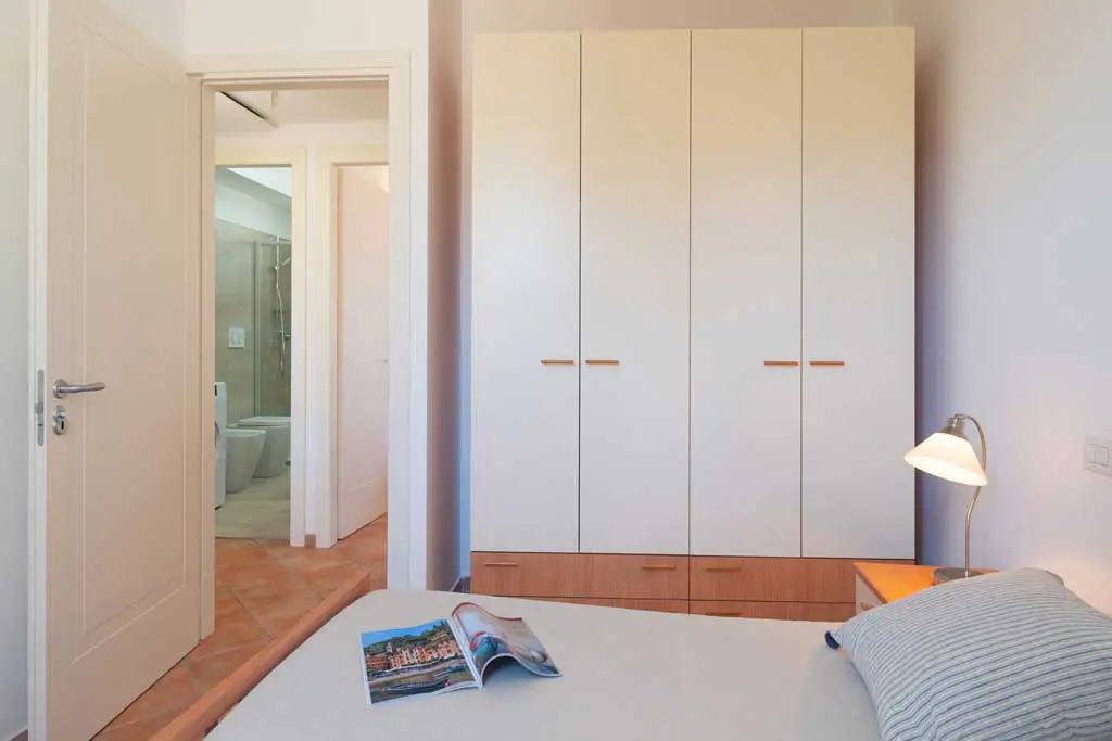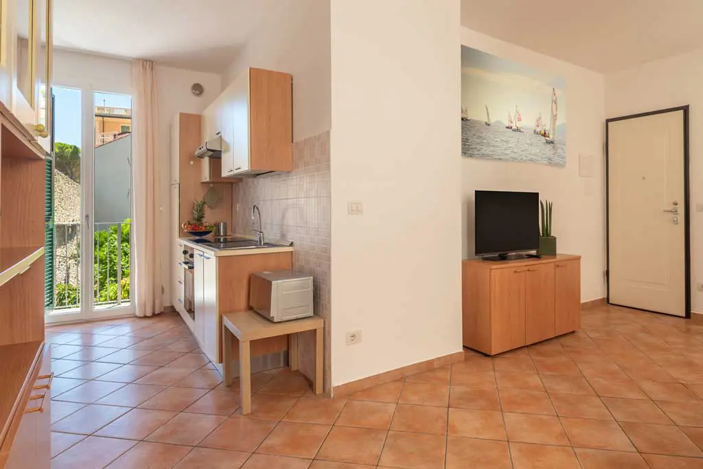 Bilocale situato al primo piano, con ingresso in un piccolo disimpegno da cui si accede al soggiorno con angolo cottura, divano letto matrimoniale e ripostiglio; al bagno con doccia e infine alla camera da letto matrimoniale.